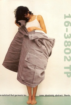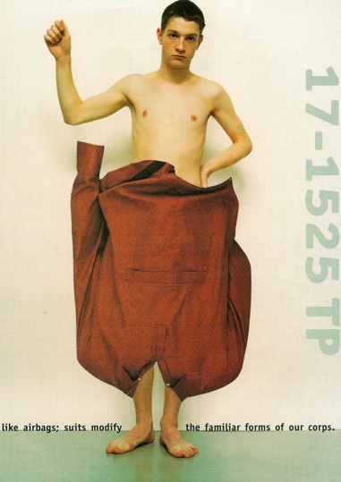 Forget small and medium. Even large and extra large. Make way for multiple X’s. Like airbags; suits modify the familiar forms of our corps. Pants and shirts build arond the body like architecture. Outsized that garments become absolutely abstract. Deploy a pair of pants as if setting up camp, occupying terrain, taking up space. Make statement about.